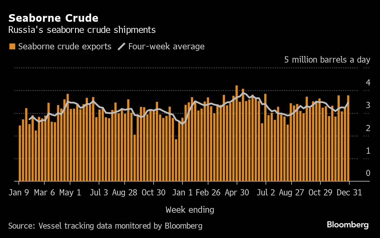 About 3.46 million barrels a day of crude were shipped from Russian ports in the four weeks to Dec. 31, tanker-tracking data monitored by Bloomberg show. That was up by 230,000 barrels a day from the period to Dec. 24. The more volatile weekly average jumped by 560,000 barrels a day to 3.78 million.