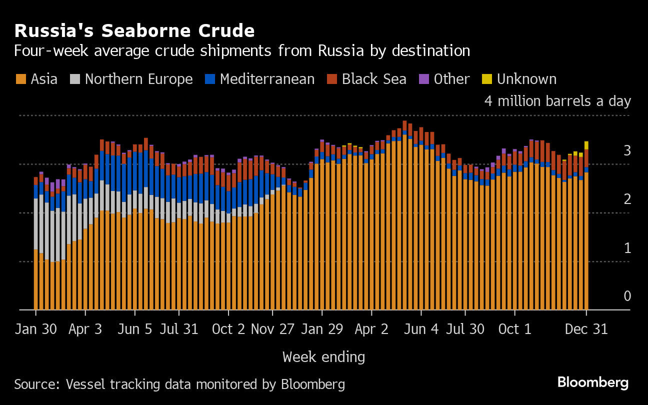 No Russian crude was shipped to northern European countries, or those in the Mediterranean in the four weeks to Dec. 31.
