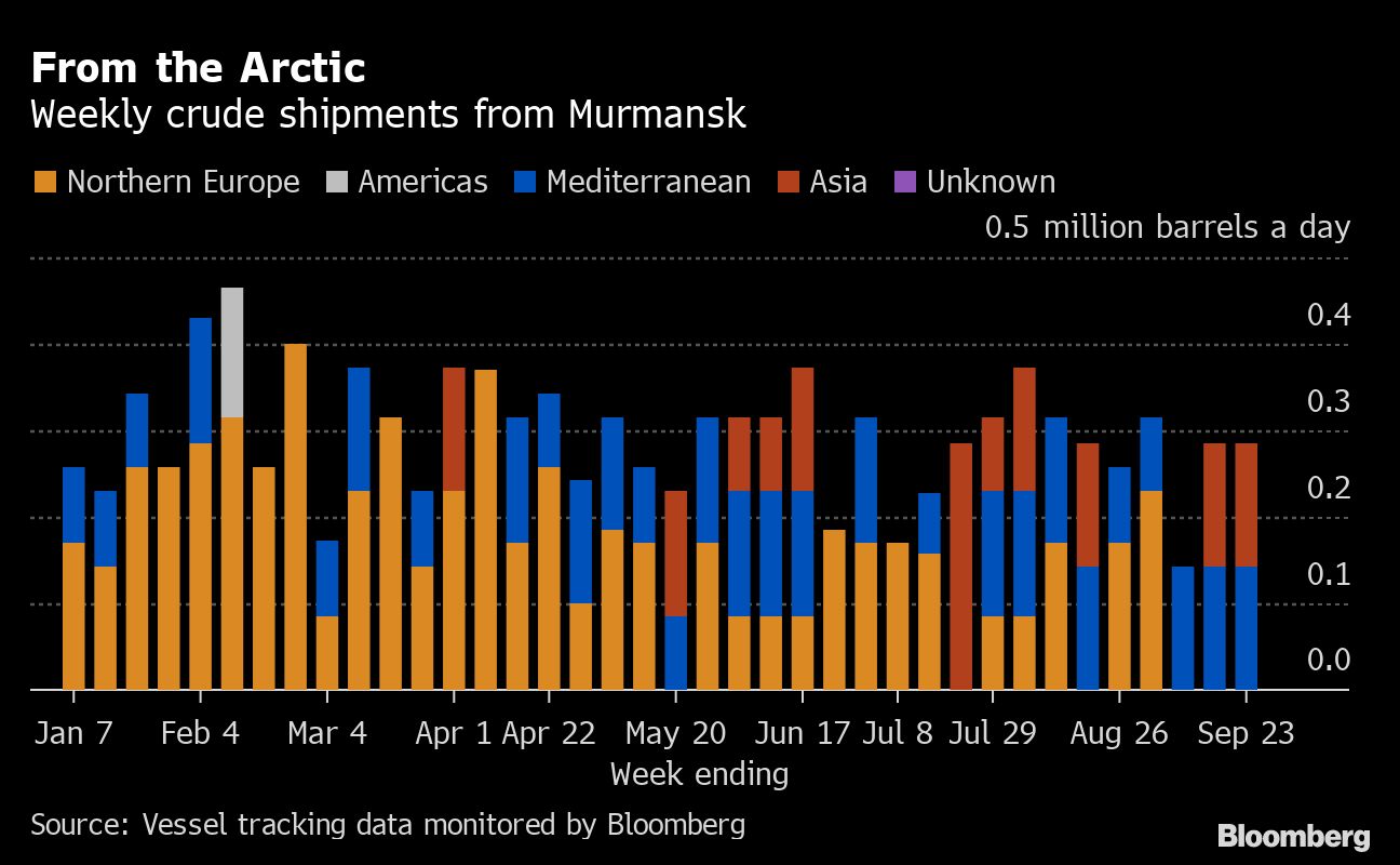 Arctic shipments were unchanged, with two vessels departing Murmansk in the week to Sept. 23.