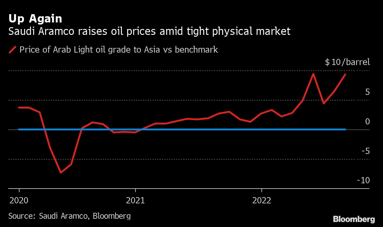 (Bloomberg) -- Saudi Arabia increased next month's oil prices for its biggest market of Asia amid signs that underlying demand remains robust despite growing recessionary concerns.