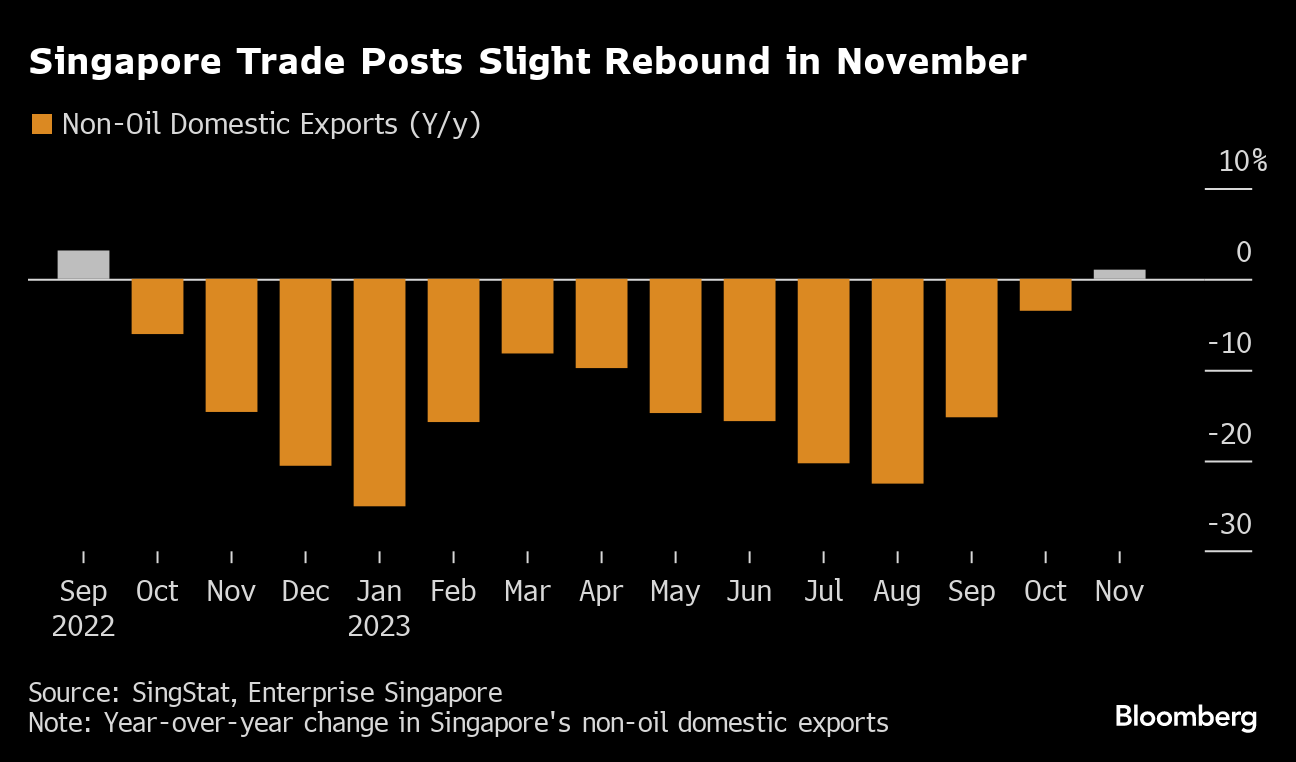 Official data Monday showed non-oil domestic exports grew 1% in November, slower than the median expectation for a 1.5% gain in a Bloomberg survey. The expansion was mainly because of a low base in the year-ago period, according to Enterprise Singapore.