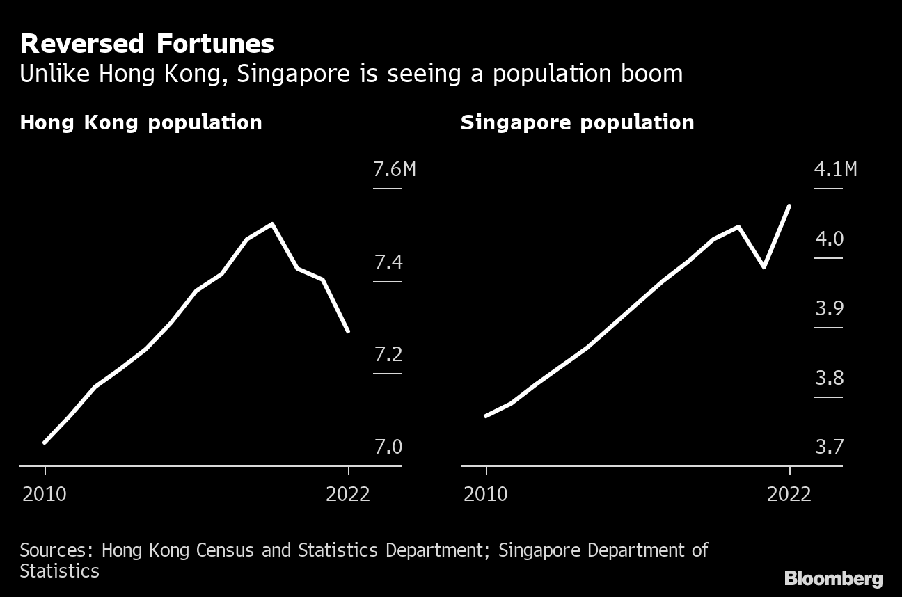 That influx of people and capital is in contrast to Hong Kong, where the population is shrinking as expatriates and locals leave the city due to stringent Covid controls and a tightening political grip from Beijing. Singapore's resident population rose 3.4% in June from a year earlier.