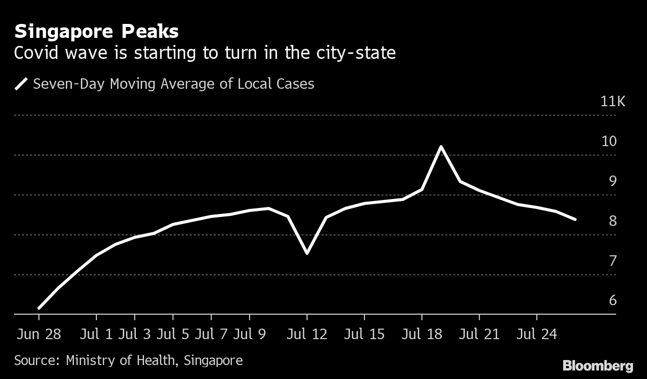 (Bloomberg) -- Singapore's latest Covid-19 wave, driven by omicron variants, appears to be declining after surging in July, with the health minister saying this week that the infection tide is “coming to a peak, and starting to turn”.