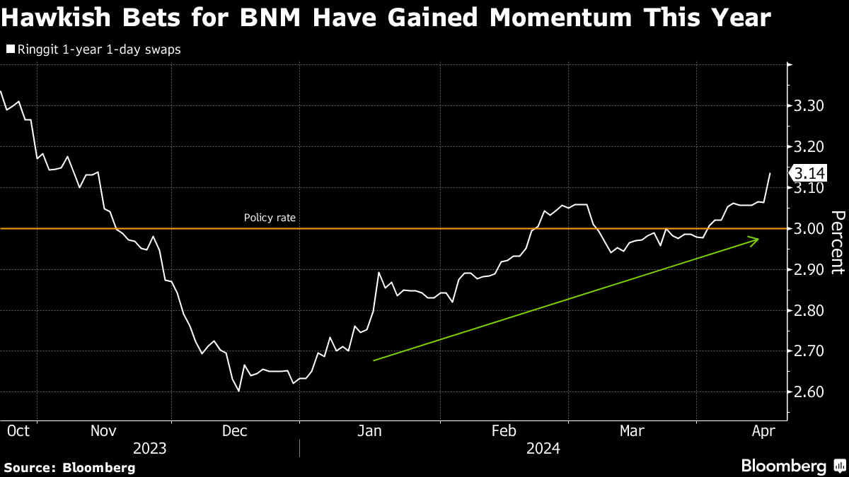 Traders have turned slightly more hawkish for Bank Negara Malaysia since the end of March, based on ringgit one-year one-day swaps, according to Bloomberg-compiled data. The ringgit's persistent weakness has pushed back expectations for a rate cut further into 2025, despite the country's sluggish economy. The Malaysian policy rate's record discount to the upper bound of the Fed's benchmark — at 250 basis points — has been one of the main reasons behind the currency's weakness. BNM has already resorted to encouraging state-linked firms to more consistently repatriate foreign investment income and to convert it into the local currency.