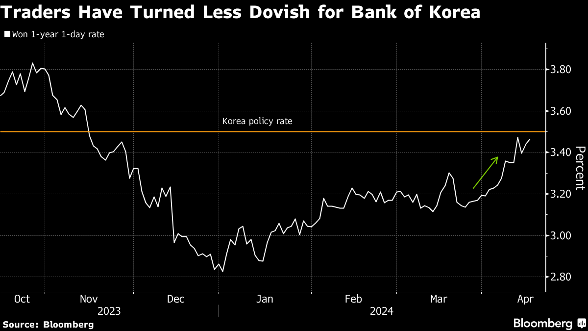 Traders are pricing around a 5-basis point cut over the next twelve months, reining in their expectations for a full quarter-point cut at the end of March, according to Bloomberg-compiled data. As a net energy importer, elevated oil prices are driving import prices higher and threaten policymakers' efforts to combat inflation. “With the strong data coming from US and oil price going higher, the ‘high for longer' theme has come back to markets again,” BNP Paribas' global markets strategists Chandresh Jain and Parisha Saimbi wrote in an April 15 note. The probability of rate cuts “from Bank of Korea will decrease if this persists.”