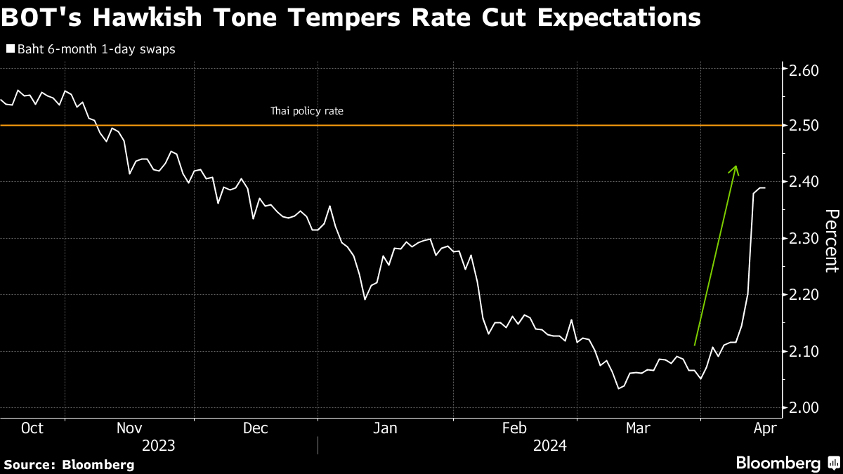 Traders are pricing around 15-basis points of easing from the Bank of Thailand over the next six months, down from expectations at the end of March for nearly 50 basis points, according to Bloomberg-compiled data. “In our view, the hawkish tone at BOT's April meeting and later Fed cuts have reduced the chance of a BOT rate cut in June,” Goldman Sachs Group Inc. analysts including Danny Suwanapruti wrote in an April 11 note. They are penciling in only two quarter-point cuts in the second half of the year, cooling from earlier expectations of a cumulative 75-basis point reduction.