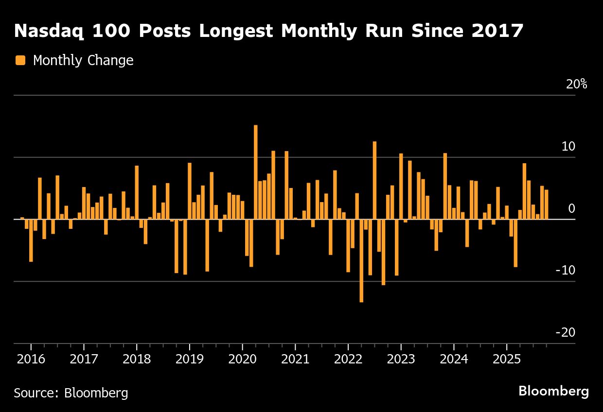 Since the April meltdown, the S&P 500 has soared almost 40%, notching its longest monthly advance since 2021. The superlative is even better for the Nasdaq 100: a seven-month surge that turned out to be the longest winning run in eight years, buoyed by tech's pristine balance-sheets and AI bullishness.