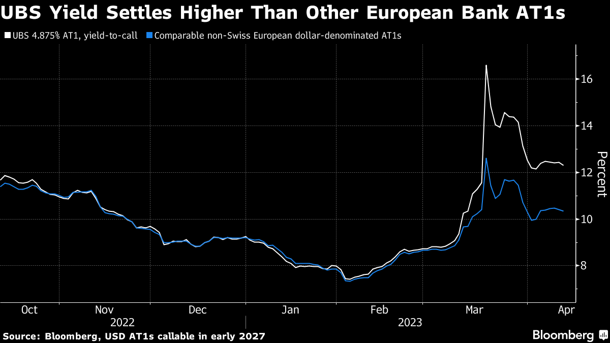 Swiss AT1 yields are still elevated compared with other European banks in the wake of the Credit Suisse writedown. The yield that investors demand until a $1.5 billion bond UBS Group AG bond is callable in early 2027 stands at more than 12%, about 200 basis points above the yield in similar notes from non-Swiss issuers.