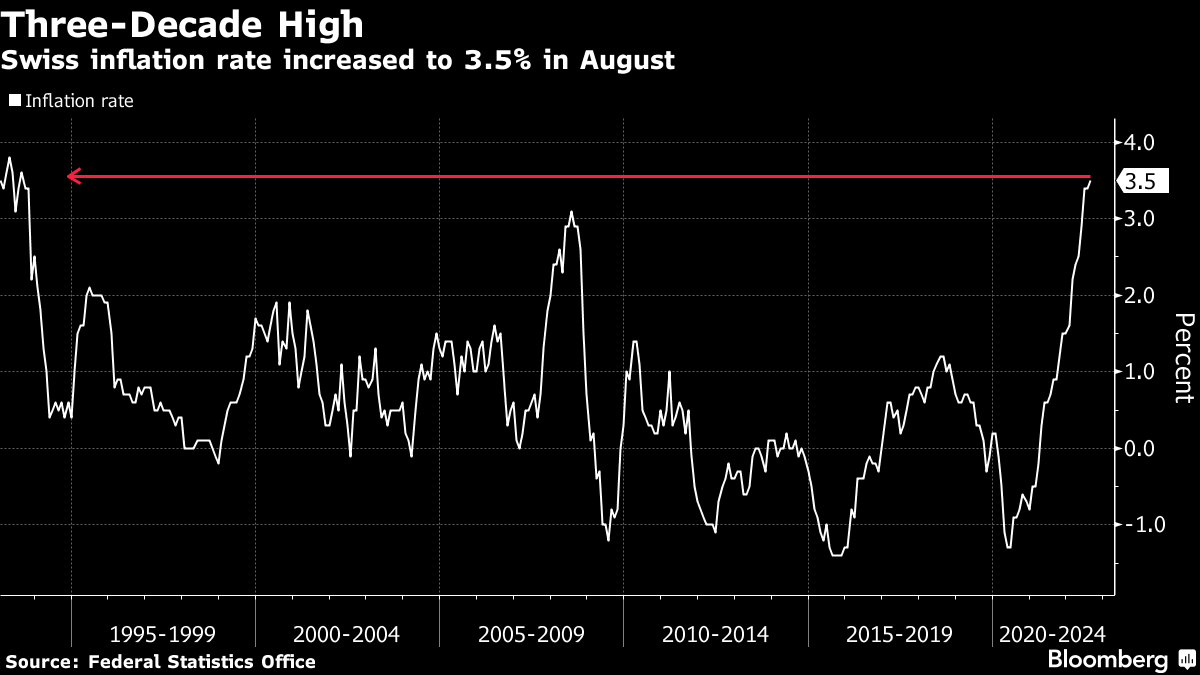 Swiss prices increased by 3.5% in August, above July's reading of 3.4% -- already the highest in three decades -- and well above the Swiss National Bank's 2% inflation target. Based on a European Union-harmonized measure, it was at 3.3%, compared with 9.1% in the surrounding euro area.