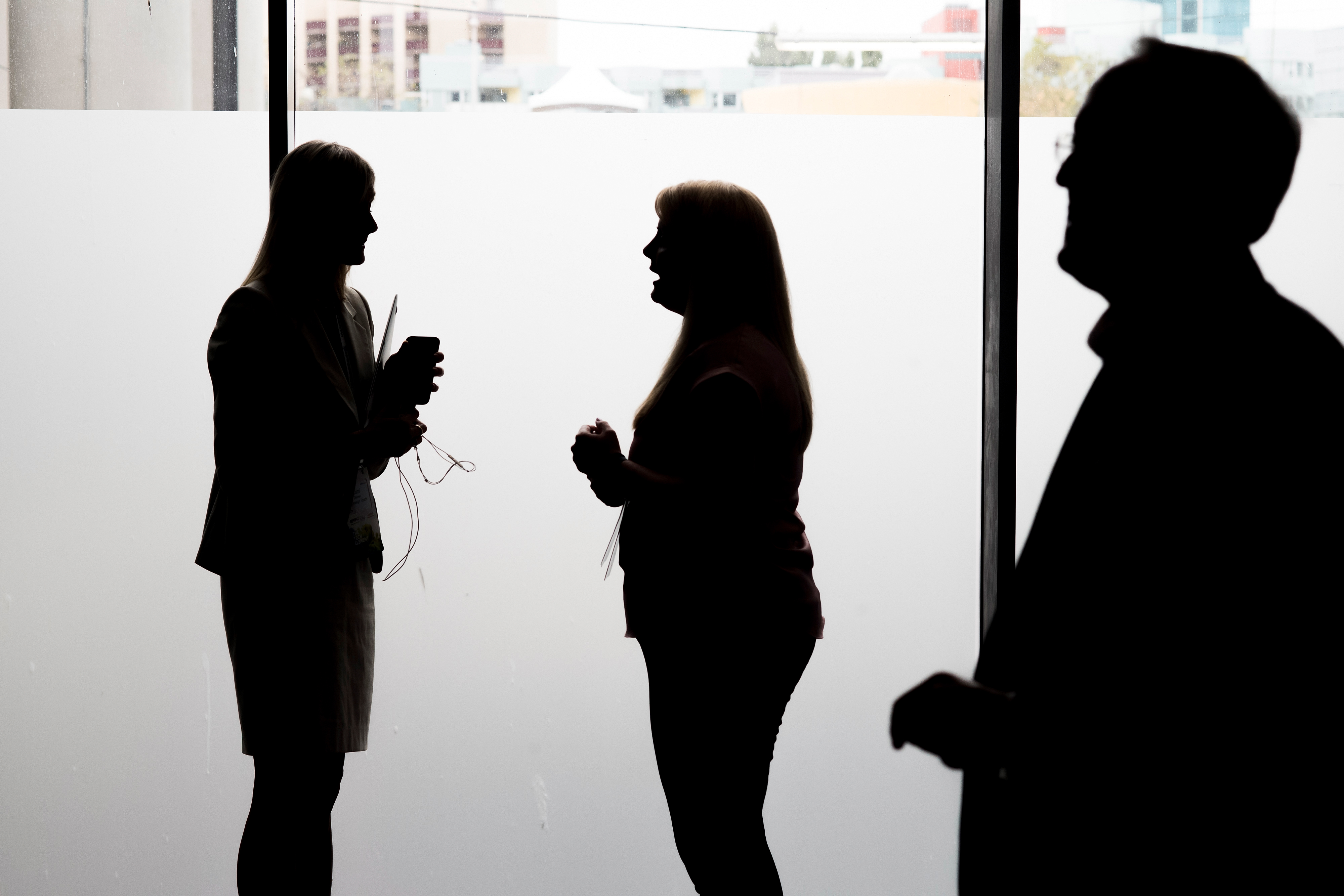 The silhouettes of a man and women as they speak outside a conference room during the Mobile World Conference Americas event in San Francisco, California, U.S. (Photographer: David Paul Morris/Bloomberg)