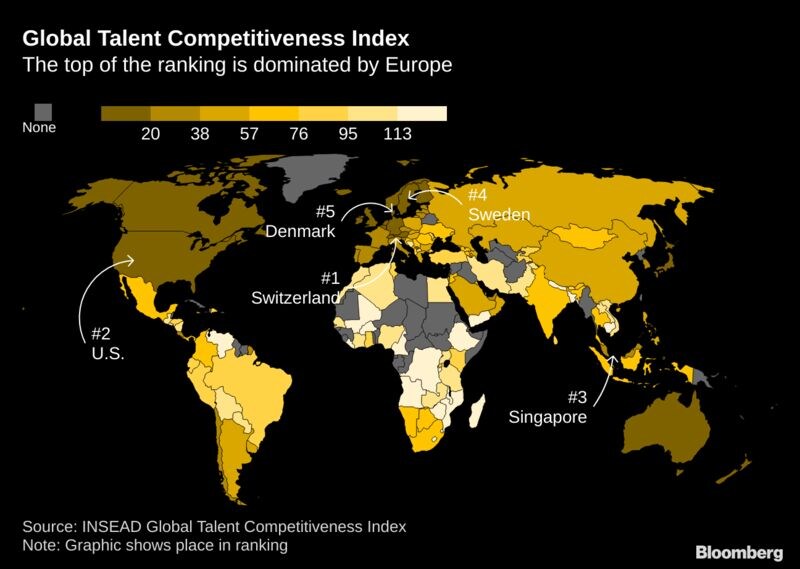 Switzerland once again clinched the No. 1 spot in a global survey on fostering and attracting talent, edging out the U.S. and Singapore, according to the Global Talent Competitiveness Index published by French business school, INSEAD. Europe dominated the highest positions, with only seven non-European countries in the top 20. As was the case in previous years, “the best-ranked countries include a significant number of small high-income economies, many of them being either landlocked, island or quasi-island economies,” INSEAD said.