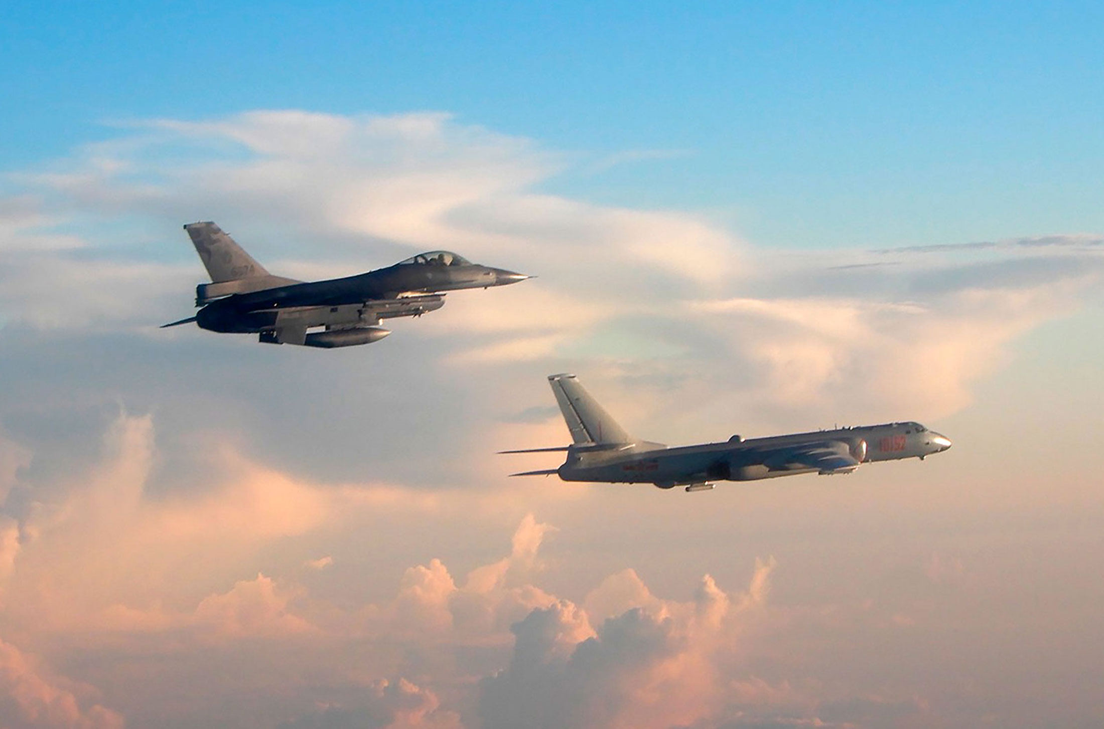 A Taiwanese Air Force fighter aircraft, left, flies near a Chinese People’s Liberation Army Air Force (PLAAF) bomber that reportedly flew over the Luzon Strait south of Taiwan. (Source: Taiwan Ministry of National Defence)