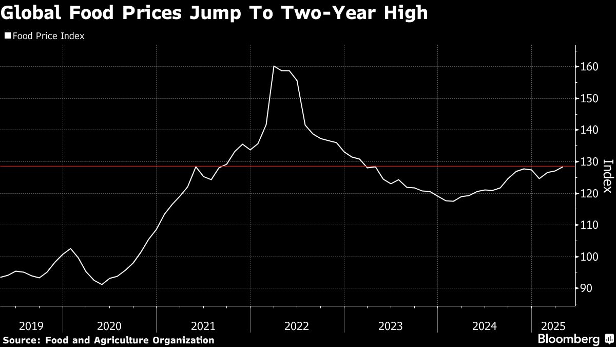 Global food prices rose to a two-year high in April, a sign that tariff uncertainty is starting to put a squeeze on trade.