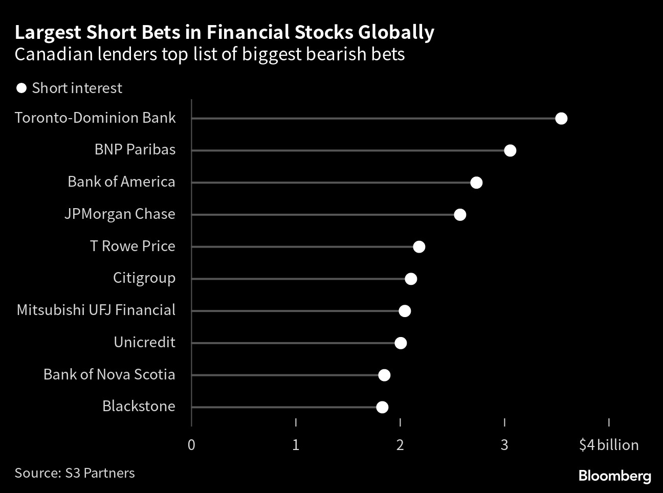 (Bloomberg) -- Turns out, the biggest short in the banking industry anywhere in the world isn't in Switzerland or Silicon Valley, but rather, in the relatively tame financial center of Canada.