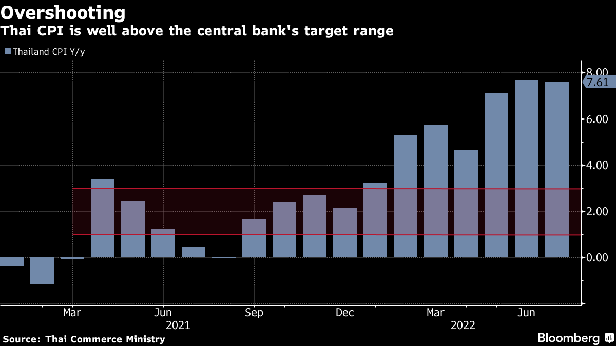 (Bloomberg) -- Thailand's central bank raised the benchmark policy rate for the first time in more than three years, belatedly joining a global tightening spree to tame inflation.