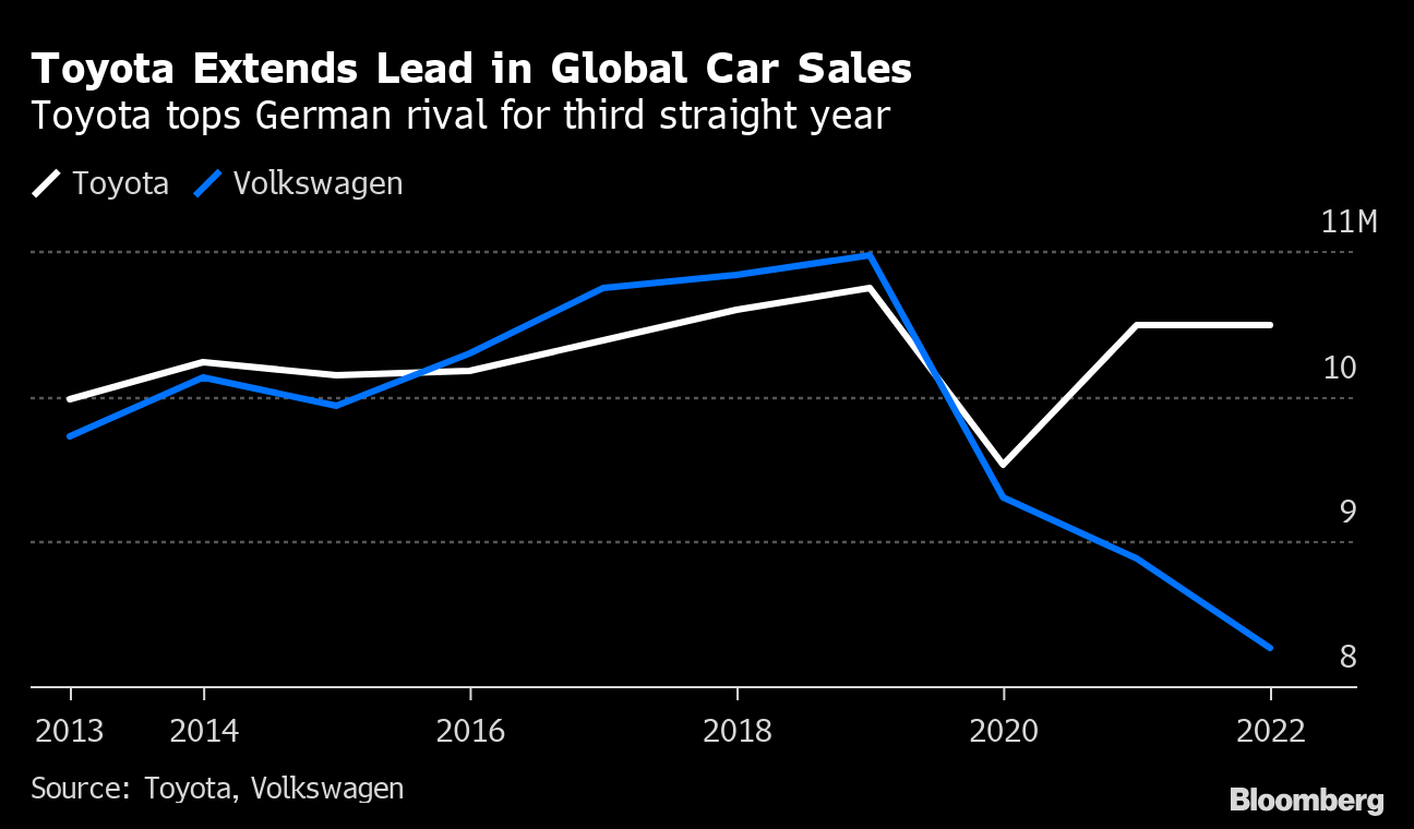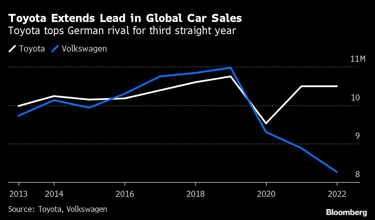 (Bloomberg) -- Toyota Motor Corp. kept its crown as the world's top-selling carmaker in 2022, widening its lead over Volkswagen AG even as supply-chain disruptions continued to weigh on global automobile production.