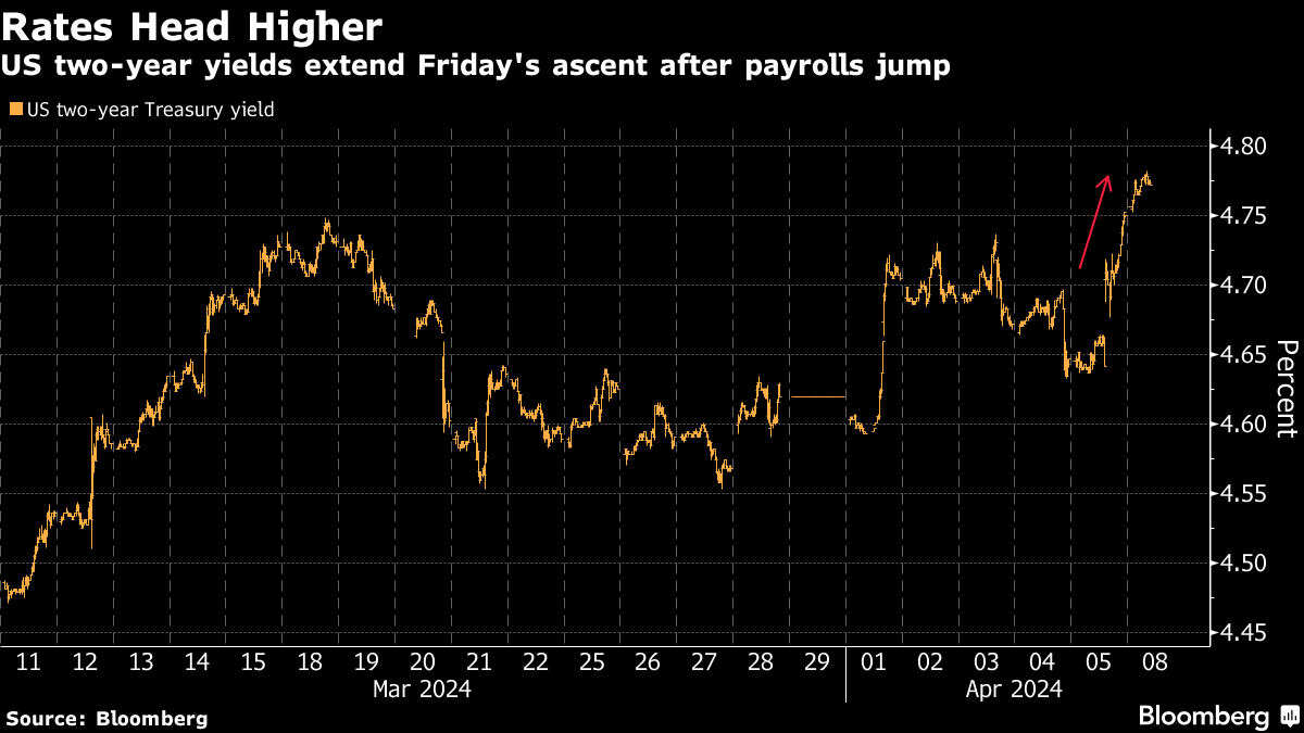 Treasuries fell on Monday along with peers, sending yields across the curve to the highest levels of the year. The two-year rate rose three basis points to 4.78%, while the 10-year one are was within striking distance of the key 4.5% level that some investors are watching as a major threshold that could determine whether rates revisit last year's highs.
