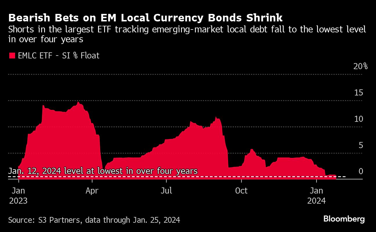 Outstanding bearish positions on the $3 billion VanEck Morgan EM Local Currency Bond exchange-traded fund fell to 0.69% of the float, the lowest since October 2019, according to data from S3 Partners.