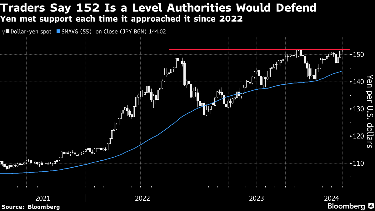 “I don't think there is anything to worry about here on the intervention front as they just don't have the big whippy moves that you would normally see prior to an intervention,” said Brad Bechtel, global head of FX at Jefferies. “If we gapped through 152 and then up to 155 in a very short period then maybe they would jump on it, but if we are just bouncing around and grinding higher, not so much of a concern.”