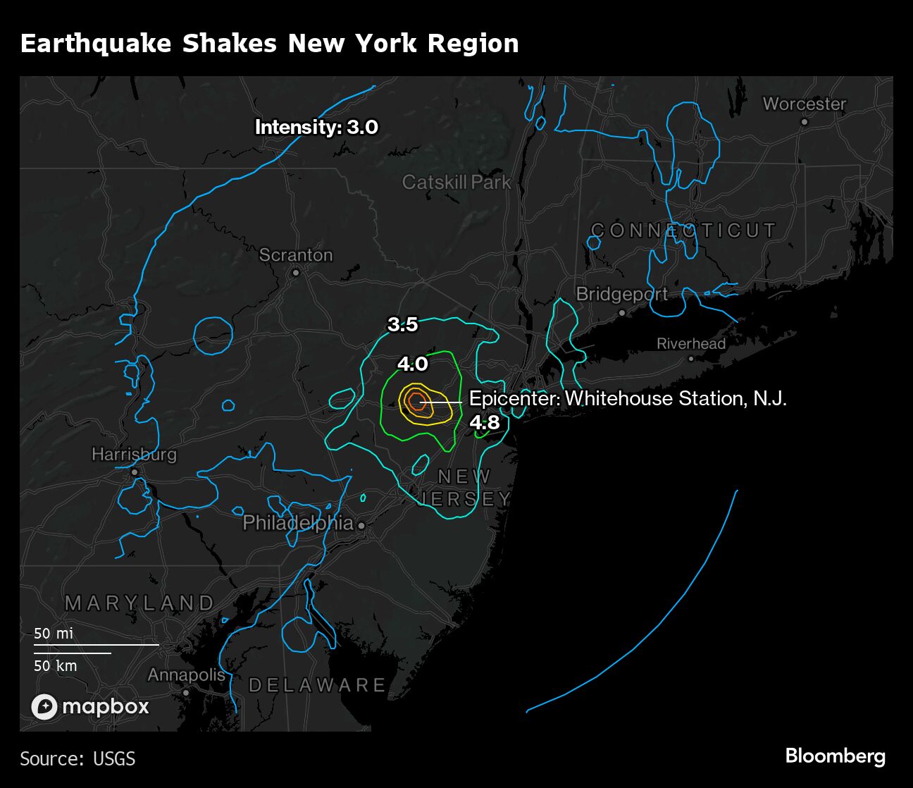 The preliminary 4.8 magnitude temblor was the strongest in the New York area since 1884, according to the US Geological Survey. It occurred near Whitehouse Station, New Jersey, and was felt along the Acela rail corridor from Massachusetts to Washington, D.C.