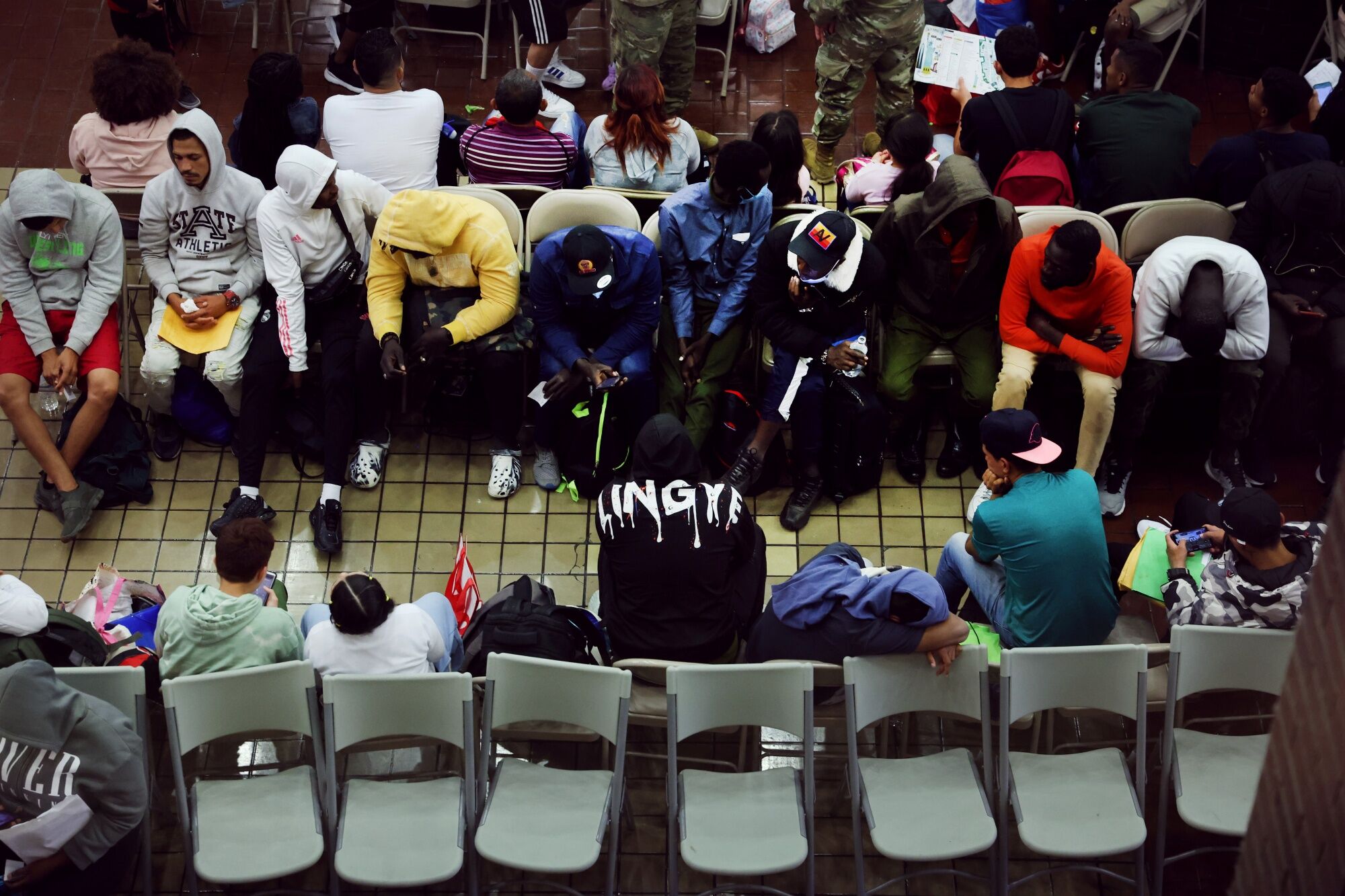 NEW YORK, NEW YORK - MAY 15: Newly arrived asylum seekers wait in a holding area at the Port Authority bus terminal before being sent off to area shelters and hotels on May 15, 2023 in New York City. (Photo by Spencer Platt/Getty Images)