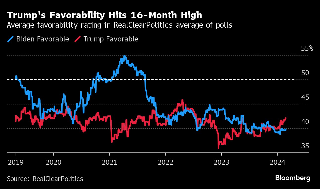 (Bloomberg) -- The average favorable rating for Donald Trump hit its highest level since before the 2022 midterm elections, as the former president marches toward a likely November rematch against a less popular Joe Biden.