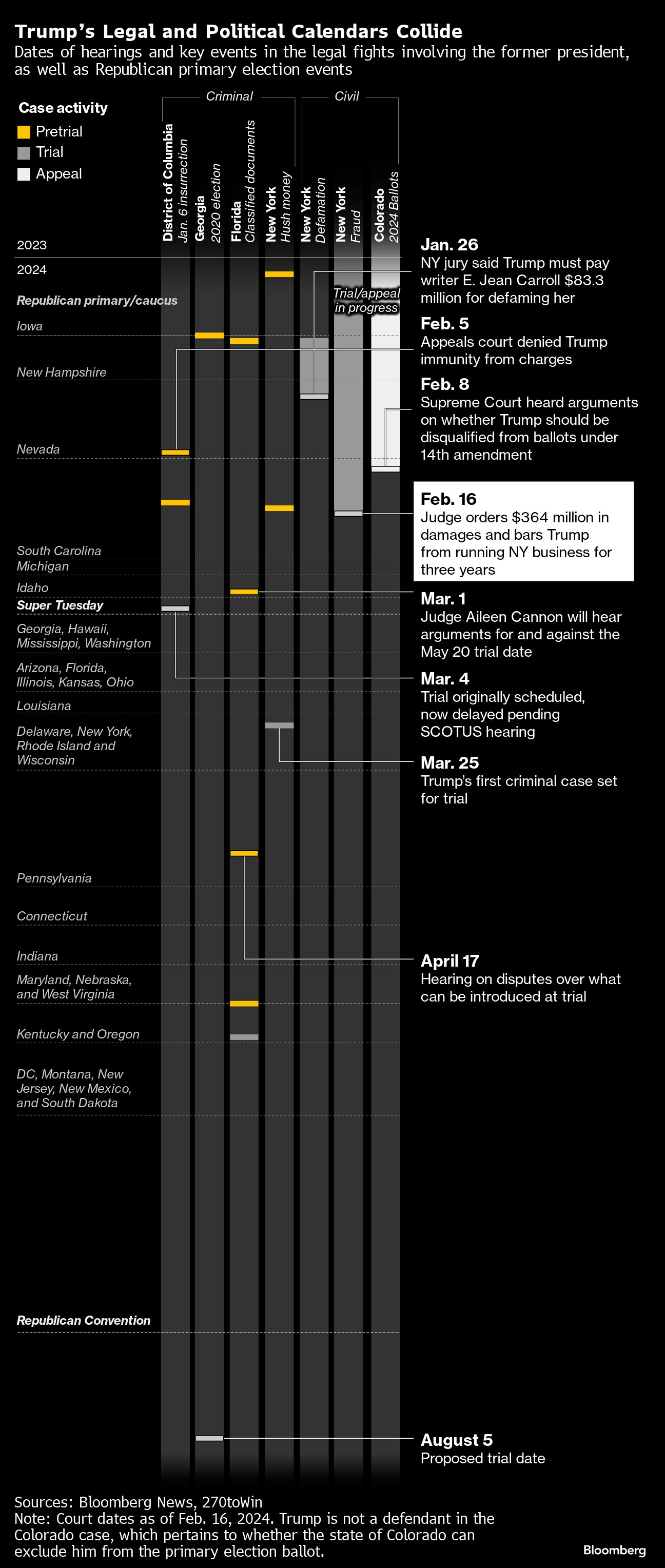 (Bloomberg) -- Donald Trump and his real estate company suffered a major defeat in New York's civil fraud suit over his inflated asset valuations, after a judge barred the former president from running any business in the state for three years and ordered $364 million in penalties plus interest.