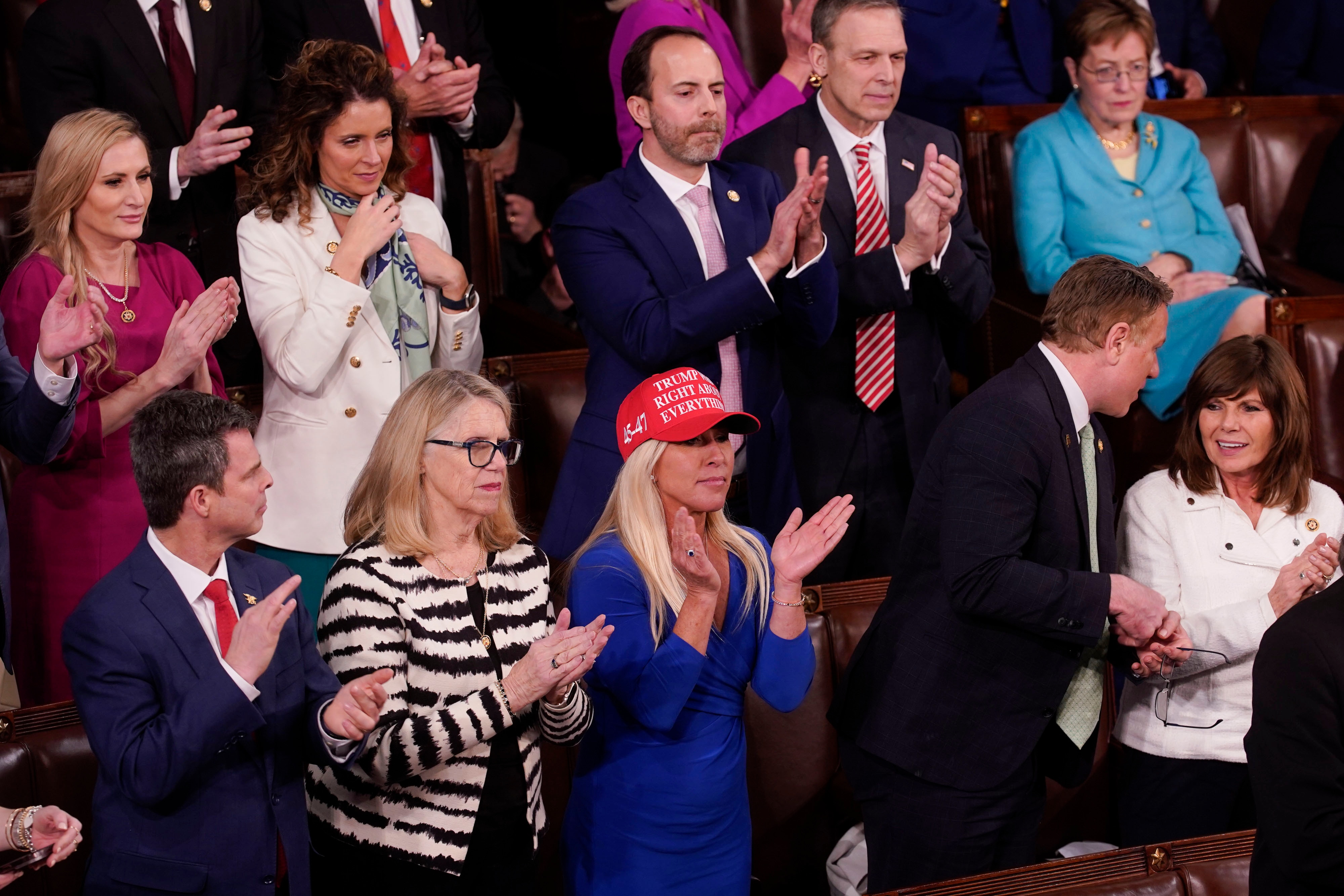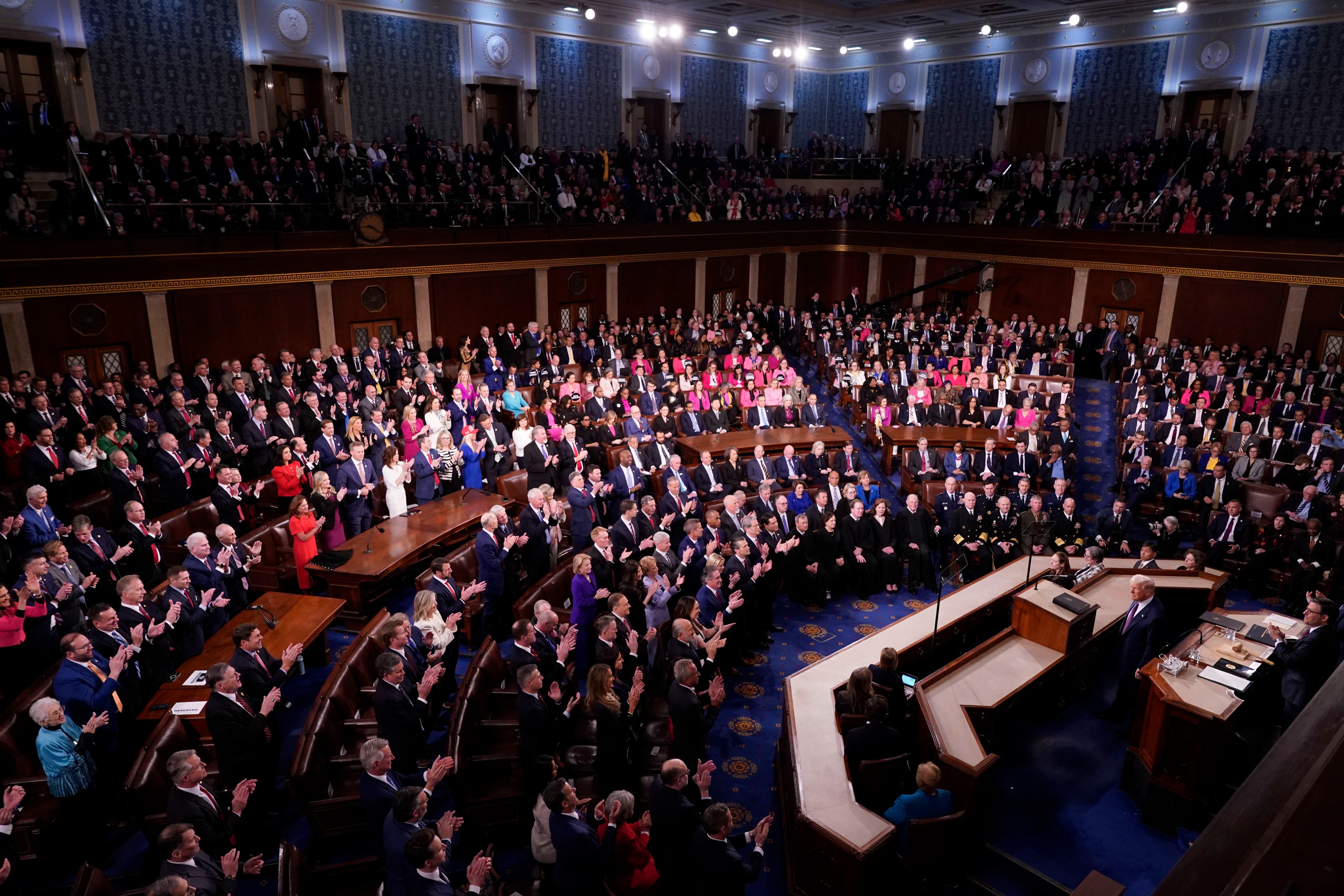 Georgia Representative Marjorie Taylor Greene, one of Trump's staunchest allies, wore a red hat which read “Trump was right about everything,” and the president took the stage to chants of “USA.” Democrats remained seated during the rest of Trump's remarks, with some holding signs that read “Musk Steals” — a reference to billionaire Trump adviser Elon Musk — and “False.”