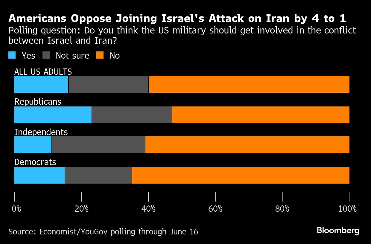 The question of whether to strike Iran has the potential to cause domestic political headaches for Trump, whose base is split between isolationists and traditional conservative interventionists. Supporters of both political parties oppose the US joining Israel's attack on Iran by clear majorities, a YouGov survey found.