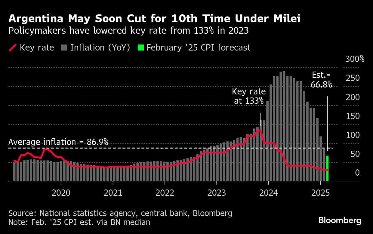 After February data's released on Friday, Argentina watchers are on alert for the bank's 10th rate cut under Milei. It's one of the more unorthodox elements of the president's strategy to slow inflation in South America's No. 2 economy.