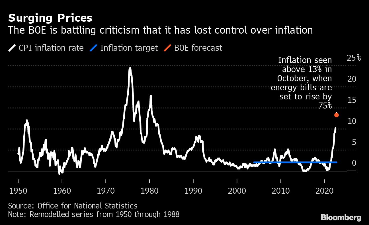 The central bank expects inflation to surpass 13% later this year when regulators allow energy bills to rise again. That would mark the worst reading since September 1980, when Margaret Thatcher's government struggled to bring a wage-price spiral under control.