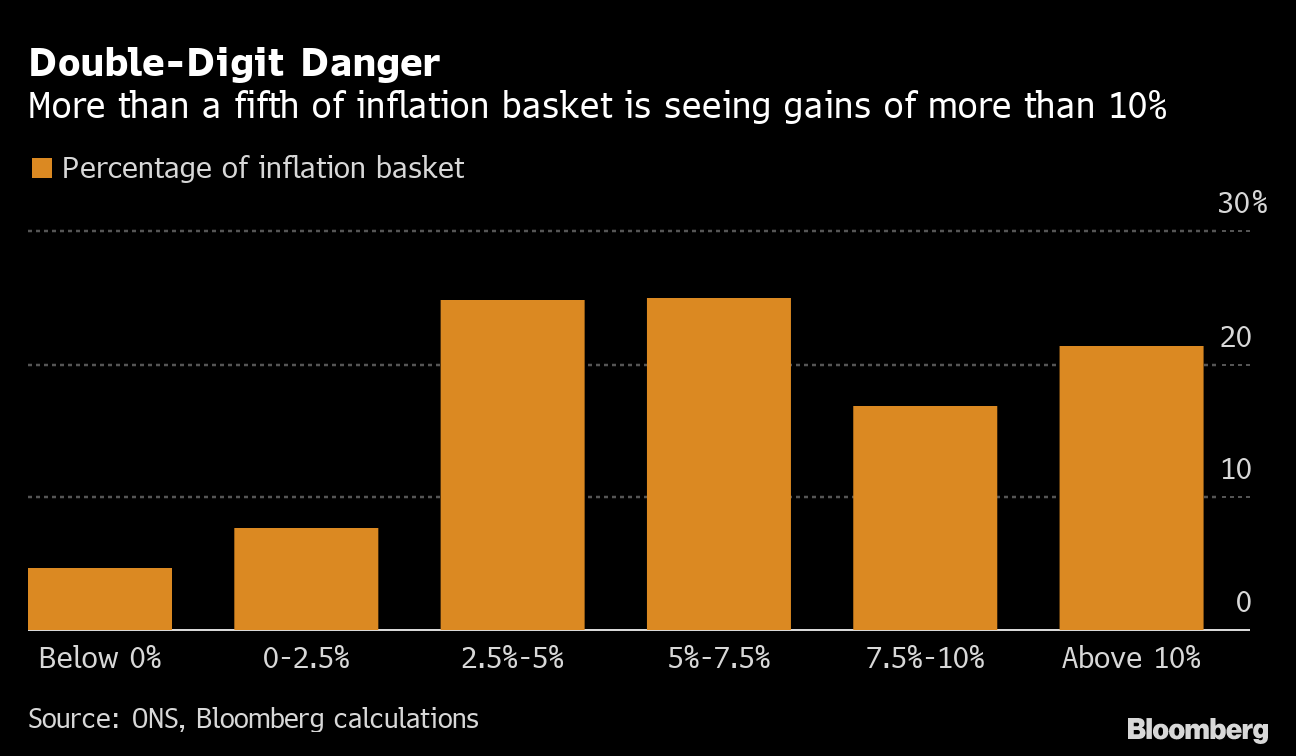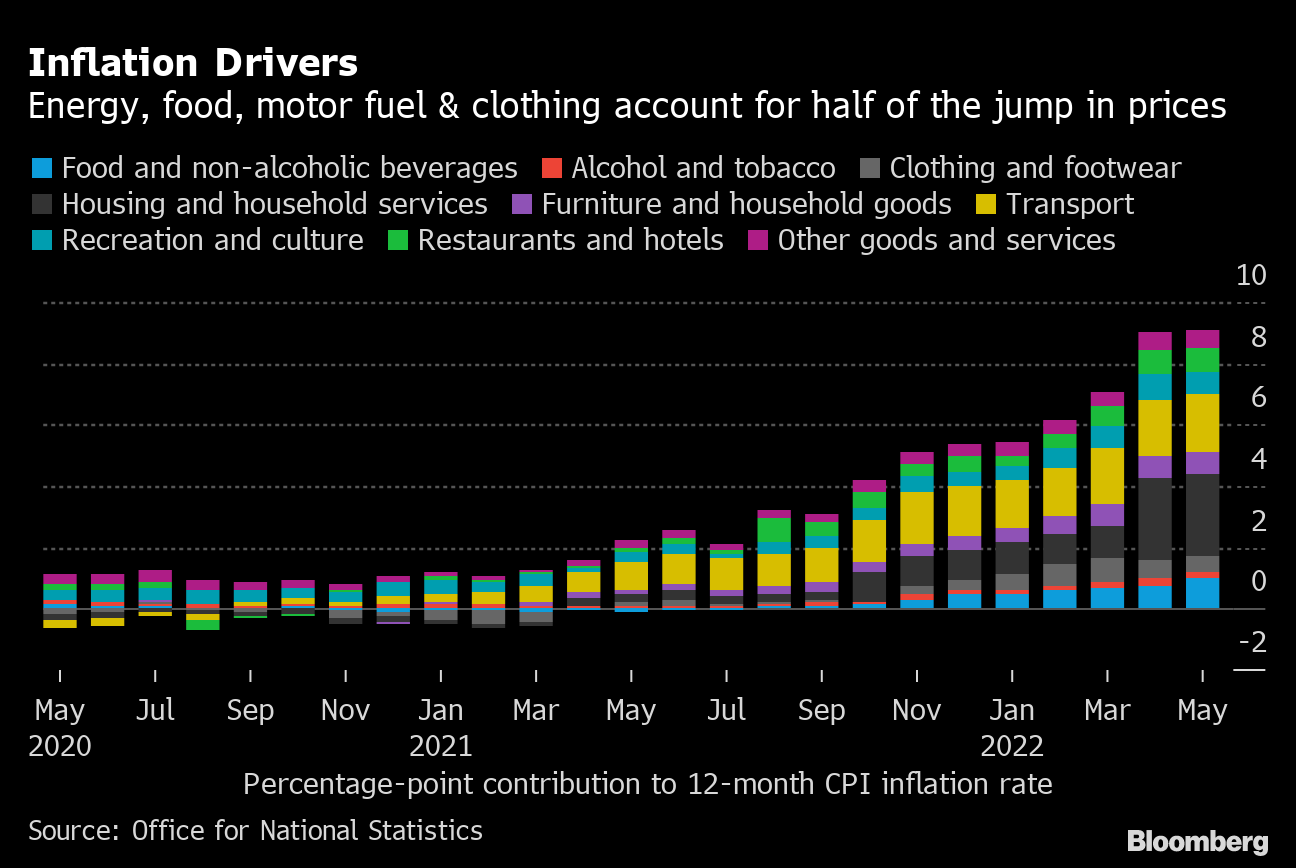 (Bloomberg) -- UK inflation rose to a fresh four-decade high in May after broad increases in the cost of everything from fuel and electricity to food and beverages.