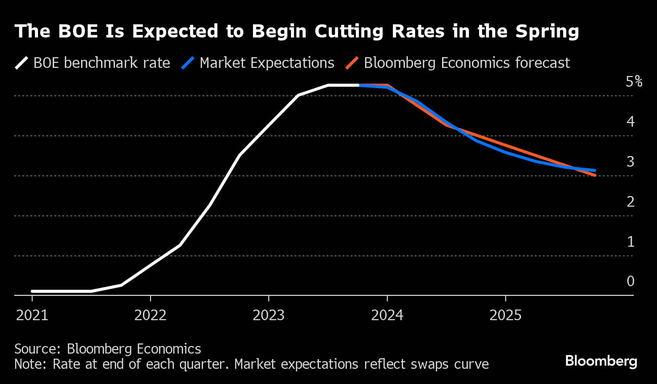 “Expectations for Bank Rate have fallen substantially over the past three months on the back of softer sequential wage growth and inflation data,” Goldman economist James Moberly wrote in a note. “We expect that the BOE will begin to lower rates in May 2024 and then cut at a 25 basis points per meeting pace.”