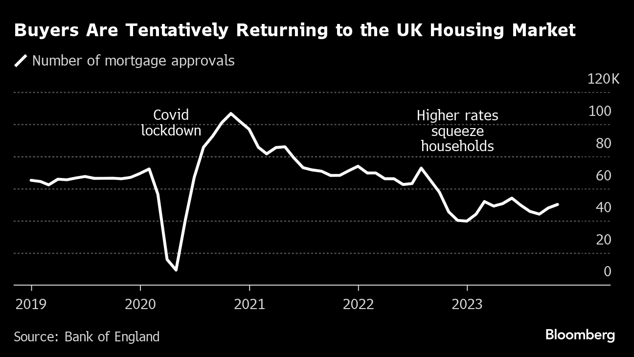 “The pressure on the UK housing market is easing as mortgage approvals continued to recover in November on the availability of slightly cheaper loan deals,” said Niraj Shah of Bloomberg Economics. “Still, the housing outlook is fragile as borrowing costs are restrictive and demand for mortgages remains well below the 10-year average.”