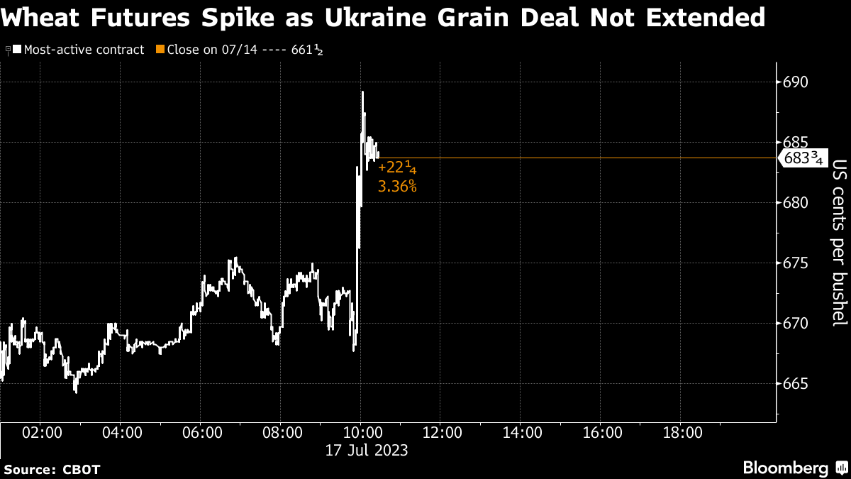 (Bloomberg) -- The Ukraine grain-export deal has ended almost a year into its run after Russia terminated the pact, heightening uncertainty over global food supplies and escalating tensions in the region.