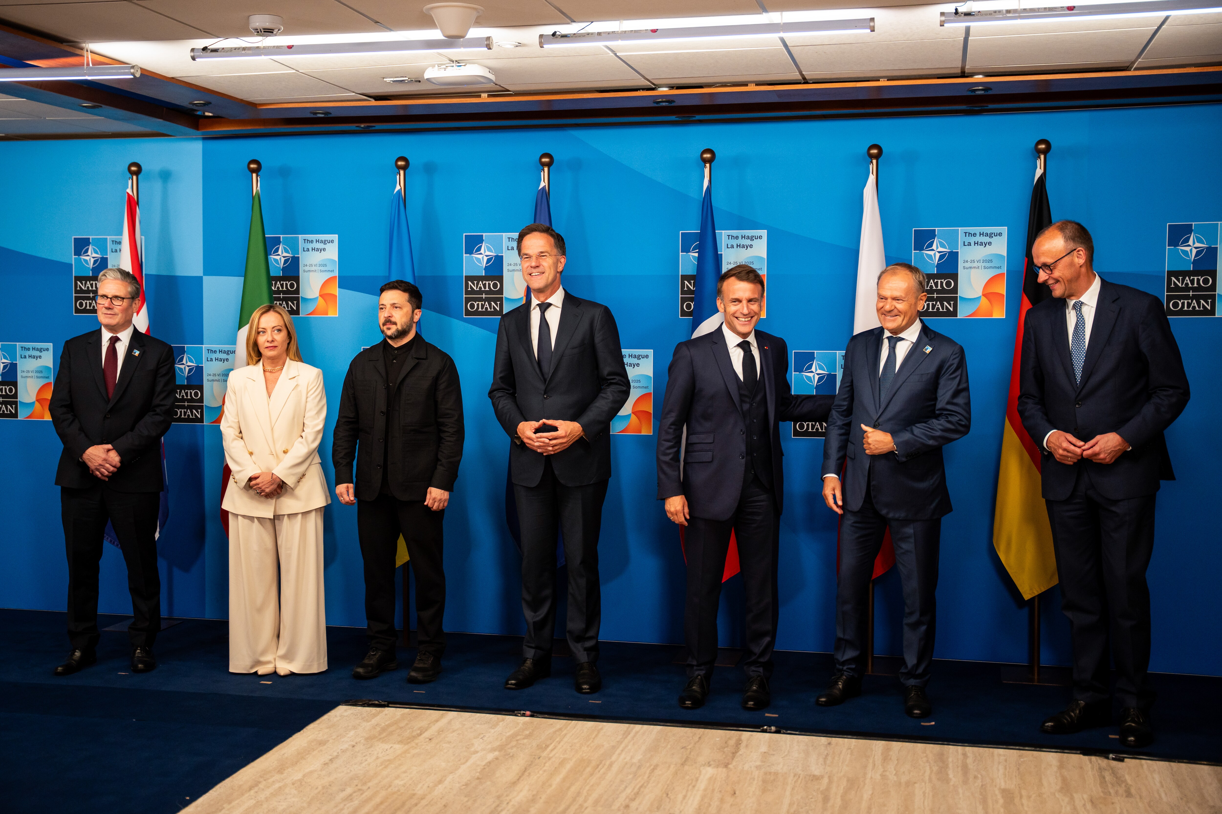 Keir Starmer, Giorgia Meloni, Volodymyr Zelenskiy, Mark Rutte, Emmanuel Macron, Donald Tusk, and Friedrich Merz, left to right, at the NATO summit on June 24.