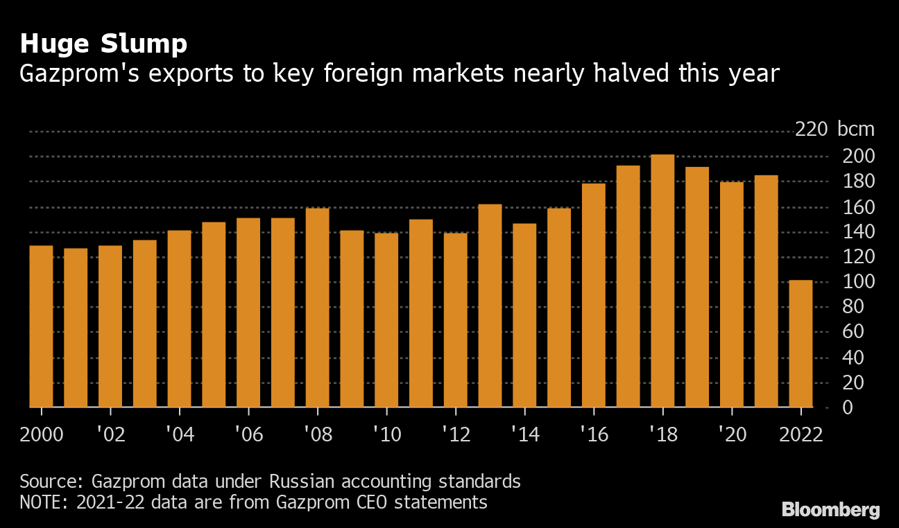 Gazprom PJSC's exports to its key foreign markets declined by almost half this year as the Russian natural gas giant's flows to Europe were slashed following President Vladimir Putin's invasion of Ukraine.