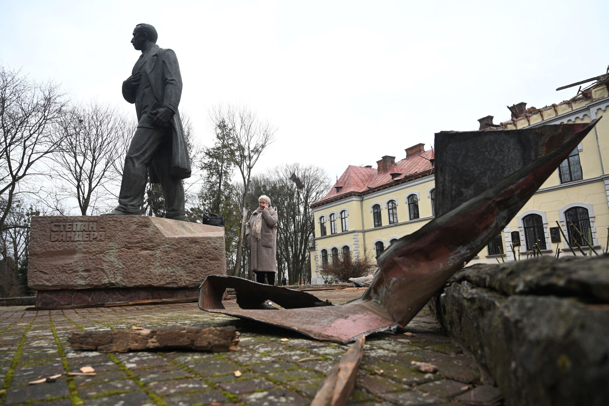 A woman stands behind the statue of Stepan Bandera outside the damaged Lviv National University of Nature Management, after a drone attack in Dubliany on the outskirt of Lviv, amid the Russian invasion of Ukraine. (Phoot source; Bloomberg)