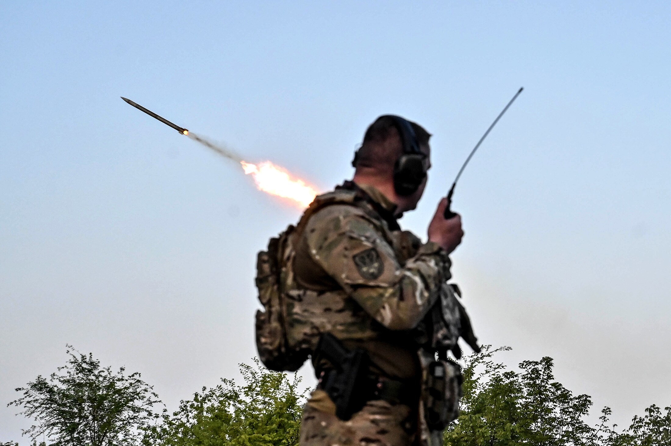 Ukrainian servicemen launch a rocket in the Zaporizhzhia Region, southeastern Ukraine, on April 27.
