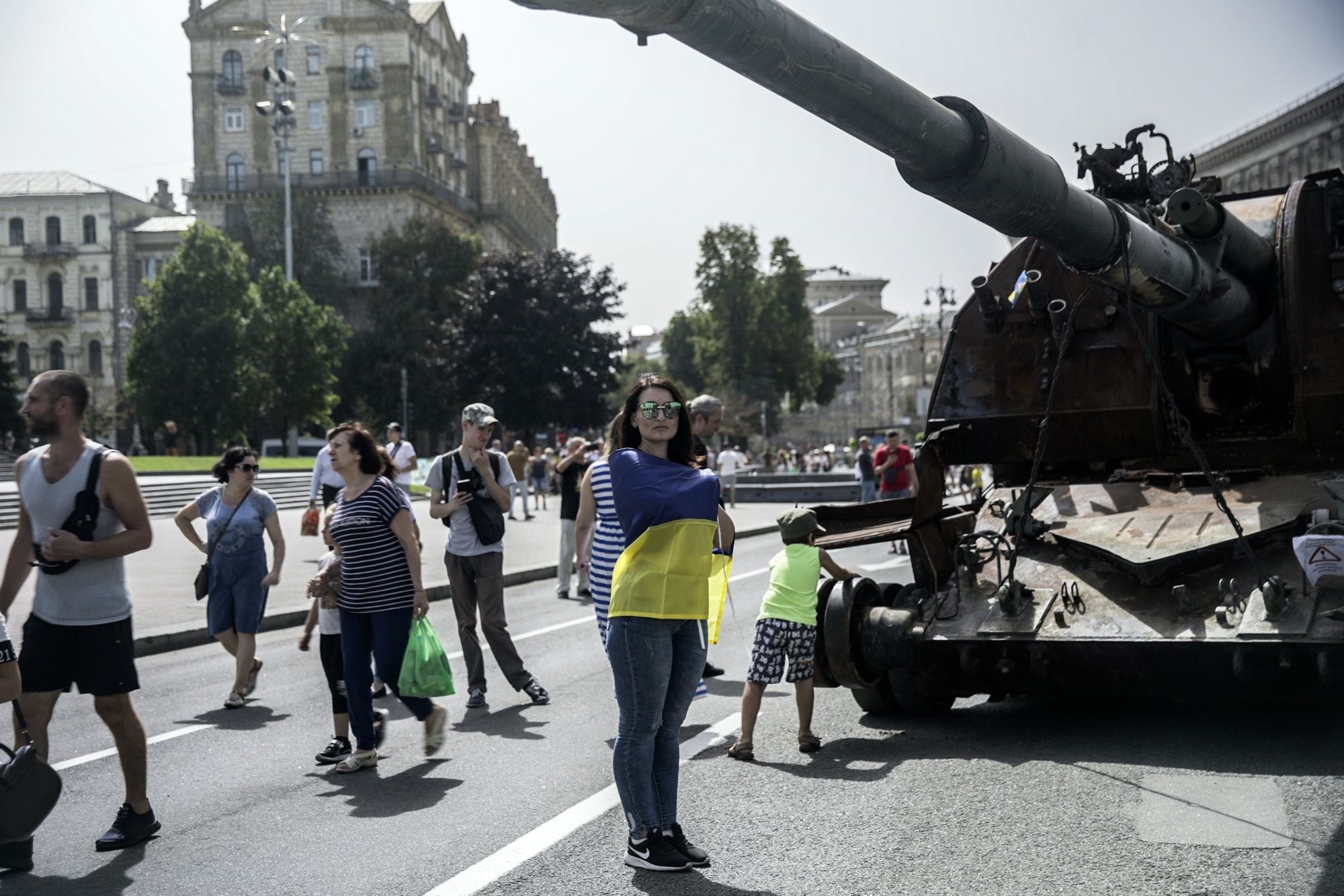 Visitors at an exhibit of Ukrainian military equipment on Khreschatyk Street ahead of Independence day, in Kyiv, Ukraine, on Monday, Aug. 22, 2022.