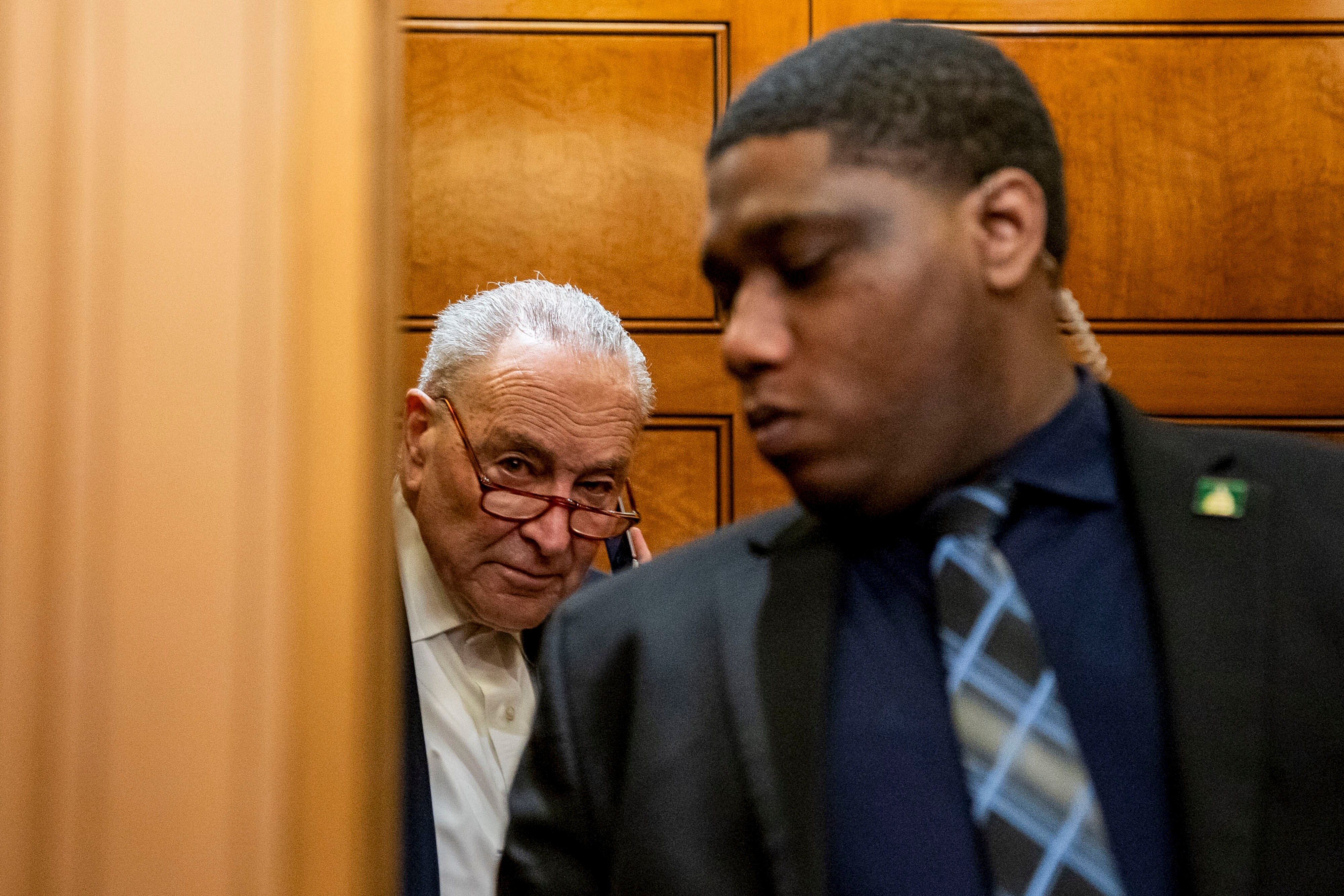 Senate Democratic leader Chuck Schumer, left, at the US Capitol Friday. (Photographer: Allison Robbert)