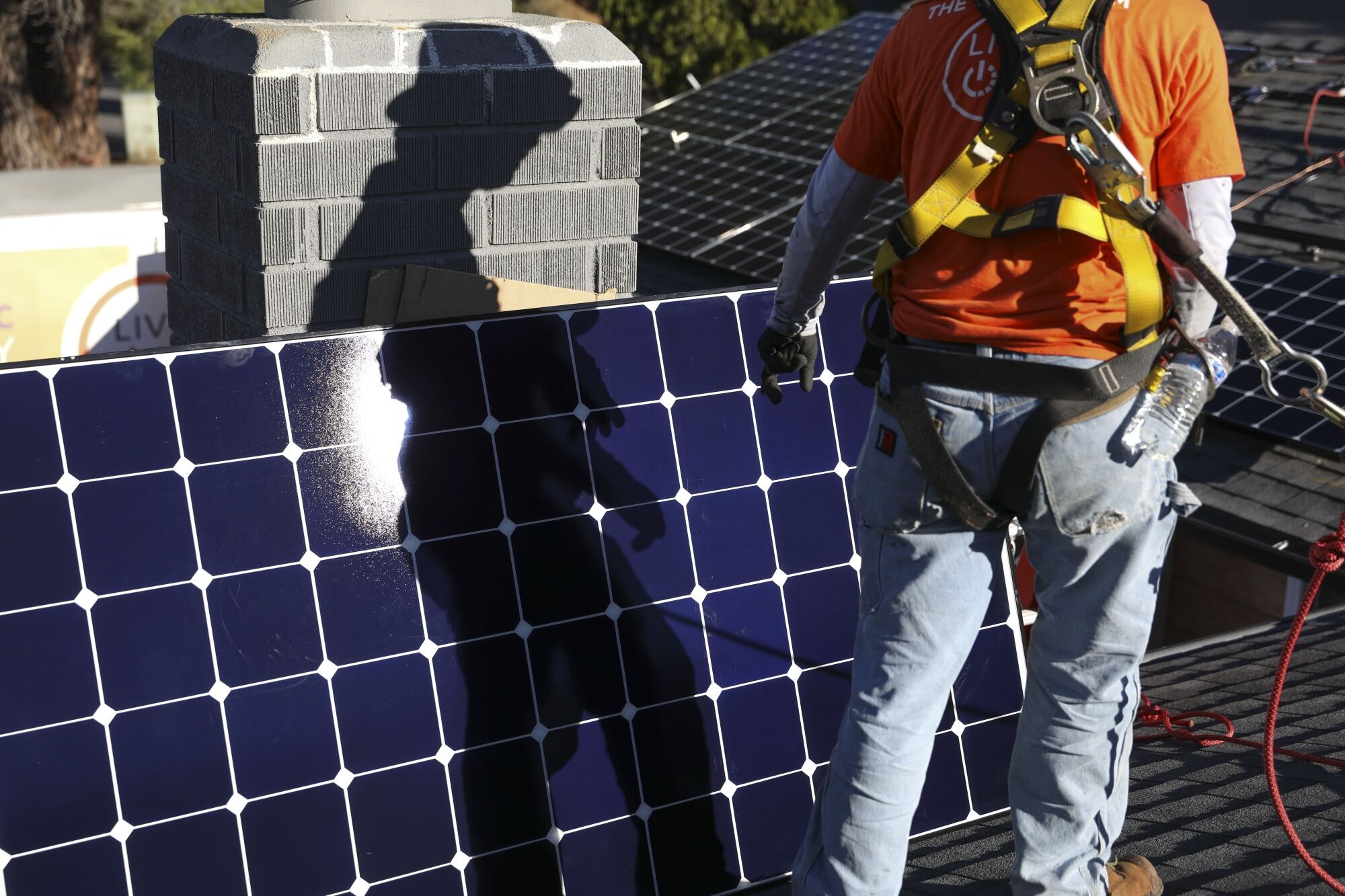 A worker installs solar panels on the rooftop of a home in Poway, California, US, on Tuesday, Dec. 5, 2023. State subsidy cuts combined with high interest rates are slowing solar installations — and costing green jobs. Photographer: Sandy Huffaker/Bloomberg