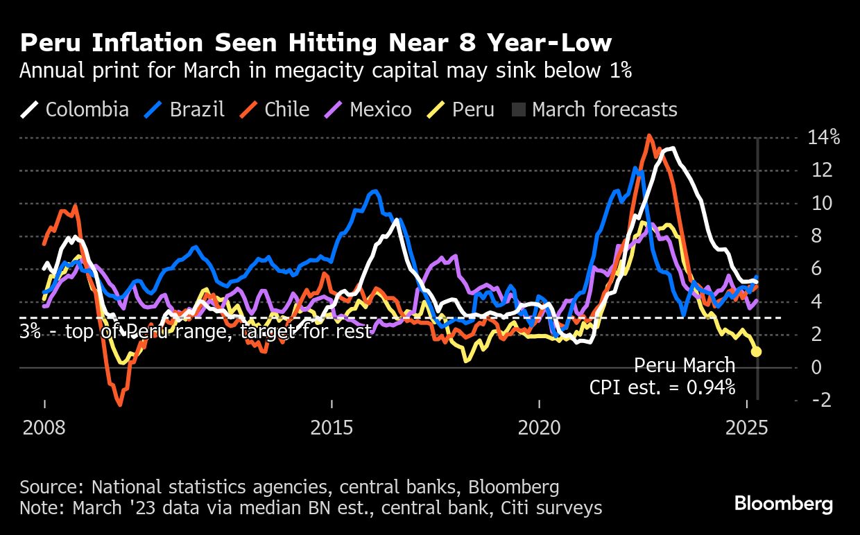 In Peru, the March consumer-price report for the megacity capital of Lima may show inflation slowed to 1% or lower, from 1.48%.