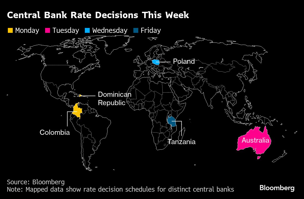 Elsewhere, policymakers around the world will be watching for Trump's tariff announcements. Central-bank decisions from Australia to Colombia may result in unchanged rates, while crucial inflation data in the euro zone will be a highlight.