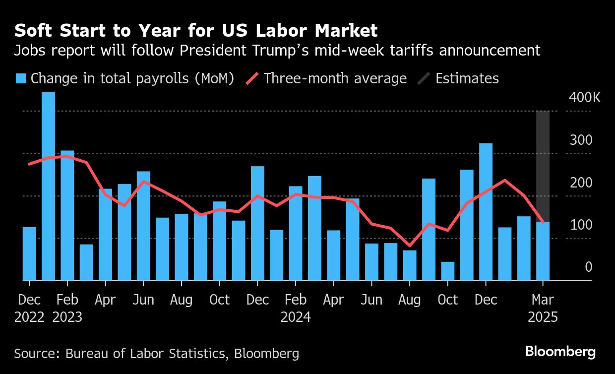US employers probably tempered their hiring in March, just as consumers grow increasingly cautious and the economic outlook dims on concerns about the fallout from higher tariffs.