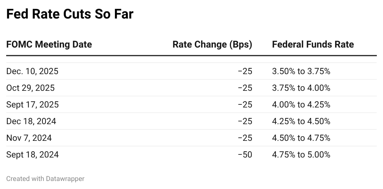 The Federal Reserve has held the fund rate steady between 3.5% and 3.75%.
