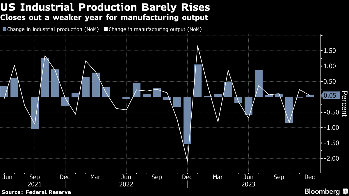 US industrial production edged up in December, consistent with sluggish manufacturing output that closed out a weak 2023.