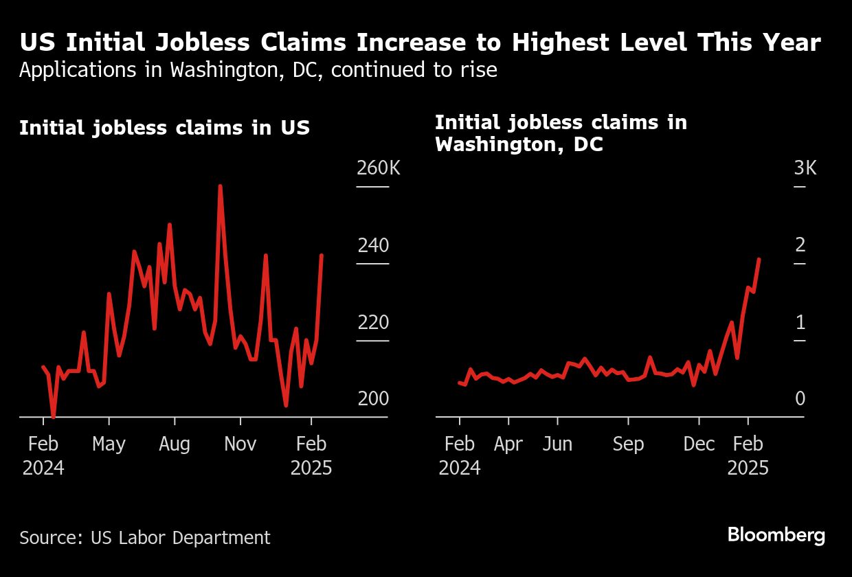Initial claims increased by 22,000 to 242,000 in the week ended Feb. 22, matching the highest level since October, according to Labor Department data released Thursday. The median forecast in a Bloomberg survey of economists called for 221,000 applications.