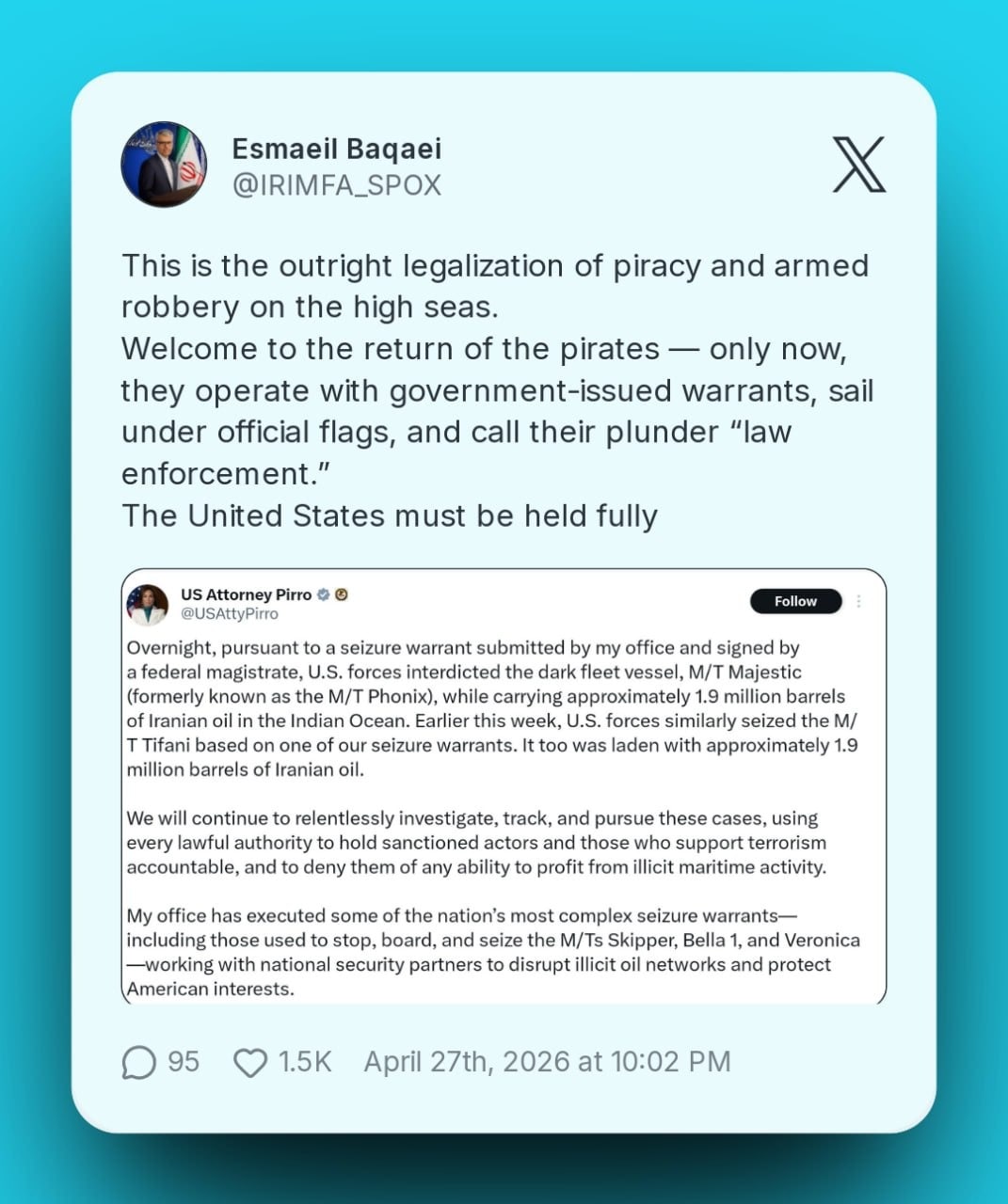 Iran’s Foreign Ministry Spox Baqaei slammed the US seizure of Iranian oil tankers as “legalised piracy” and “armed robbery on the high seas.” He said pirates have returned, now operating with government-issued warrants under official flags and calling their plunder “law enforcement.”