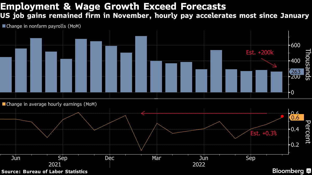 While US payrolls grew faster than economists expected last month, rising by 263,000 from October, the pace of wage growth was an even bigger surprise. Average hourly earnings rose twice as much as forecast.